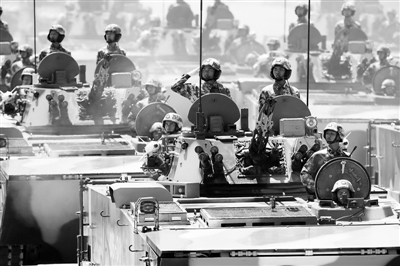 像一陣蔚藍色的波濤洶涌起伏,威武的海軍陸戰(zhàn)隊從南海之濱趕來,駕馭著18輛海洋迷彩涂裝的05式新型兩棲步戰(zhàn)車駛過天安門。