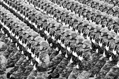 看,那一個個整齊的排面,鑄成一堵堵鐵壁銅墻;那一支支鋼槍,連成一道道神圣防線;那一聲聲足音,匯成一曲曲英雄樂章。