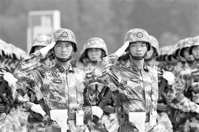 夏季的北京,熱浪滾滾,閱兵訓練場熱得像蒸籠,官兵們卻把訓練標準加了又加。上操一身汗,下操一身堿,曬得黝黑,只有帽帶處留下了一道白色的印痕,官兵們形象地稱之為“閱兵徽記”。“寧掉幾層皮,也要走整齊”、“流兩桶汗水,創一流成績”,這是官兵們共同的心聲。