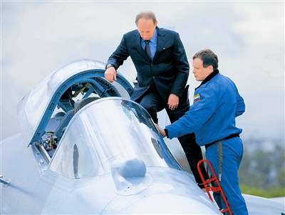 17日,在俄羅斯首都莫斯科市郊外的茹科夫城,俄羅斯總理普京(左)參觀由俄羅斯蘇霍伊公司研制的第五代隱形戰斗機T-50。新華社發