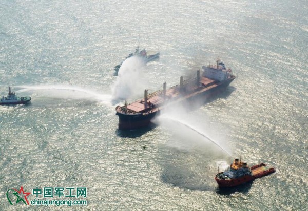 10月31日,救援船只在演練中對貨輪進行噴水“滅火”。
