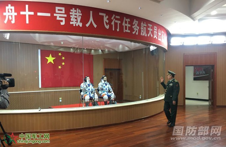 景海鵬代表飛行乘組對(duì)黨和人民的關(guān)懷、首長(zhǎng)的鼓勵(lì)表示感謝,表示一定服從命令,聽(tīng)從指揮,密切配合,精心操作,圓滿完成神舟十一號(hào)飛行任務(wù)。請(qǐng)祖國(guó)和人民放心!
