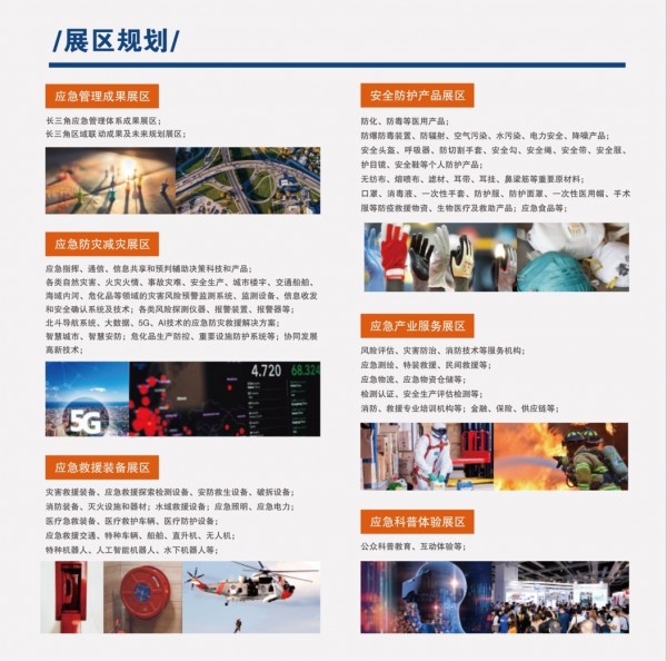 長三角國際應(yīng)急博覽會在展區(qū)規(guī)劃中打破了原有相對單一的行業(yè)展區(qū)——適應(yīng)國家大安全、大應(yīng)急的整體規(guī)劃,按照災(zāi)害和事故的安全應(yīng)急管理過程環(huán)節(jié),設(shè)置六大展區(qū),分別為:應(yīng)急防災(zāi)減災(zāi)展區(qū)、應(yīng)急救援裝備展區(qū)、安全防護產(chǎn)品展區(qū)、應(yīng)急產(chǎn)業(yè)服務(wù)展區(qū)、應(yīng)急科普體驗展區(qū)和長三角應(yīng)急管理協(xié)同發(fā)展成果展區(qū)。展品覆蓋安全應(yīng)急產(chǎn)業(yè)鏈,對接政府采購、商業(yè)采購和其他重要渠道采購,助力增強政府與行業(yè)交流、展商和買家洽談、產(chǎn)業(yè)和服務(wù)合作、技術(shù)和產(chǎn)品融合、企業(yè)和社會共享的多層次多維度的交流實效。