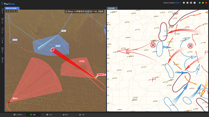 綜合態勢顯示系統(FreeXGIS Situation)基于FreeXGIS Desktop研發,涵蓋了海陸空天電網綜合態勢顯示的二次開發與應用,具有想定編輯、戰場態勢環境構建、數據接入、過程模擬、推演過程記錄及回放等功能。可通過控制場景、兵力、顯示、視角等,構建三維數字化戰場環境,實時展現出對抗雙方兵力和作戰行為,為綜合態勢分析、評估、優化提供依據。