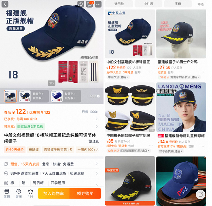 原本在冬季銷售平平的棒球帽,也因福建艦的熱度而銷量大增。福建艦由中國船舶集團負責研制,中國船舶集團的官方淘寶店“中船遠航”負責人介紹,店鋪上架了18艦“福”字帽、“18”福建艦帽子、福建艦棒球帽等多種型號的單品,很受網友喜愛。其中一款在淘寶天貓上已賣出2000多件,歌手田震曾在公開場合佩戴過該款帽子,很多網友都在淘寶上淘田震同款。