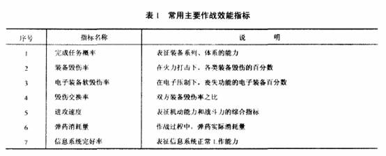 評估指標(biāo)。為對不同的武器裝備體系和系統(tǒng)的方案進(jìn)行分析、比較,需要確定量度的指標(biāo)。武器裝備作戰(zhàn)效能評估指標(biāo)與作戰(zhàn)任務(wù)緊密相關(guān),因此也具有相應(yīng)的特點(diǎn)〔如:指標(biāo)要反映作戰(zhàn)的最終目的,作戰(zhàn)目的不同,其效能評價(jià)指標(biāo)也不同;指標(biāo)要反映作戰(zhàn)的隨機(jī)性,多用具有概率性質(zhì)的數(shù)字特征來表示;指標(biāo)要反映作戰(zhàn)的復(fù)雜性,具有層次性和多樣性。通常,作戰(zhàn)結(jié)果是用人員和裝備毀傷程度來衡量的,常用的作戰(zhàn)效能主要指標(biāo)如表1
