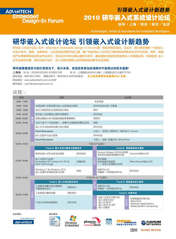 研華誠(chéng)摯的邀請(qǐng)您參加3月26日在上海舉辦的研華嵌入式設(shè)計(jì)論壇,2010研華嵌入式設(shè)計(jì)論壇(ADF-Advantech Embedded Design-in Forum),是一項(xiàng)全球性的活動(dòng)。論壇中,研華公司將發(fā)表新一代的嵌入式設(shè)計(jì)技術(shù)、趨勢(shì)、創(chuàng)新概念、以及各項(xiàng)實(shí)用的開(kāi)發(fā)工具,推廣給全球嵌入式開(kāi)發(fā)工程師和系統(tǒng)整合伙伴作為運(yùn)用。同時(shí),將邀請(qǐng)產(chǎn)業(yè)界具領(lǐng)導(dǎo)地位的合作伙伴們,例如英特爾、微軟、IBM、鳳凰科技、Wind River、群聯(lián)電子、泰科電子等各領(lǐng)域?qū)<叶紝⑴c研華一起在論壇中共同分享以服務(wù)為導(dǎo)向、具智能型與連接性的各種嵌入式裝置應(yīng)用。內(nèi)容包括:嵌入式平臺(tái)解決方案、模塊化板卡設(shè)計(jì)、嵌入式軟件服務(wù)以及網(wǎng)絡(luò)電信運(yùn)算平臺(tái)應(yīng)用等。