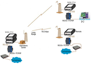 兩個或多個局域網之間,用無線網絡電臺實現點對點/點對多點網絡互連,通訊距離:50公里以上,傳輸速率9.6/19.2 Kbps。系統結構拓樸圖如下: