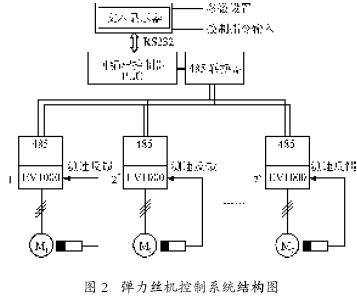 我們根據(jù)該設(shè)備工藝要求組成如圖2所示的傳動(dòng)控制系統(tǒng),可編程控制器通過(guò)RS485 轉(zhuǎn)換器與EV1000自帶的RS485接口組成通訊鏈路,文本顯示器通過(guò)RS232和PLC 連接。