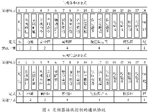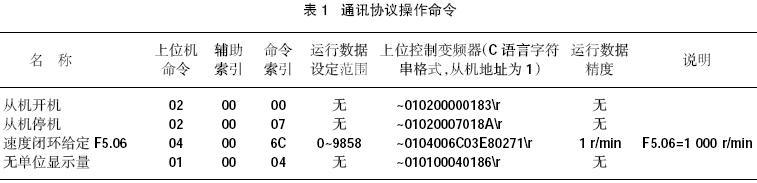 其中需要注意的是從機(jī)的地址及相應(yīng)的校驗(yàn)和。速度閉環(huán)給定指的就是工藝更改時(shí),根據(jù)基準(zhǔn)速度和各軸的牽伸比算出各軸的目標(biāo)轉(zhuǎn)速并發(fā)給相應(yīng)的變頻器。無(wú)單位顯示量指的是讀相應(yīng)地址變頻器的實(shí)際反饋轉(zhuǎn)速。設(shè)計(jì)中須用到具體操作命令的通訊協(xié)議如表1所列。