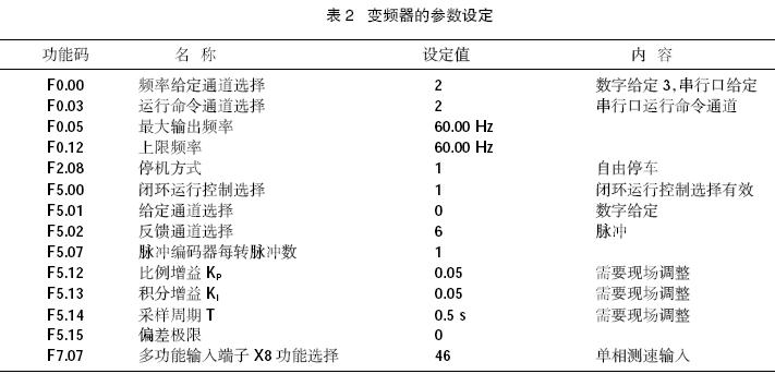 變頻器的參數(shù)設(shè)定是系統(tǒng)實(shí)現(xiàn)其功能的一個(gè)重要環(huán)節(jié),本文針對(duì)與本系統(tǒng)相關(guān)的重要參數(shù)作一簡(jiǎn)介。表2給出了這些參數(shù)的工作特性。