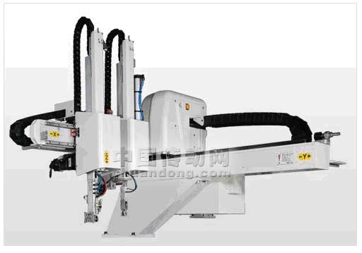 本文所述機械手是成型機專用的機械手,這種機械手在市場上按照驅(qū)動類型主要分為兩種類型:一種是有氣動元件驅(qū)動的只是單純的作低速點對點的運動控制的低端的機械手;而另一種就是要采用高性能伺服作為驅(qū)動元件的作高速精確定位的高性能機械手。在第二種機械手上面采用了臺達伺服設計,是本文討論的對象,如圖1所示。伺服在這種機械手上的應用有很多與一般伺服應用場合的不同之處,之前客戶使用的是其它伺服技術,研發(fā)結果表明臺達伺服技術在本項目能夠達到更高的性能指標,同時又能降低客戶的成本,提高其產(chǎn)品的性價比。