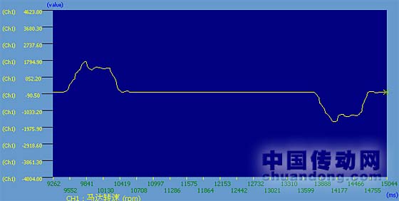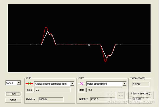 圖3、圖4兩條曲線是ASD-A伺服調(diào)試軟件抓取得實時曲線,在這樣的運行情況,伺服的運行并不平穩(wěn),伺服的運行情況是,在加速時電機會出現(xiàn)高速加速,伺服以1600rpm速度運行,在運行到中間時伺服會出現(xiàn)一個明顯加速過程,伺服的運行速度在1000rpm左右,這樣的運行情況是無法滿足客戶的要求的!