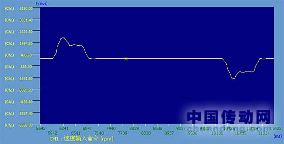通過觀察兩條曲線(圖3控制器速度命令曲線1和圖4電機運行速度曲線1)可以發(fā)現(xiàn),伺服電機幾乎是完全按照上位機速度運行命令在運動的,可是,為什么會出現(xiàn)這種加減速過程呢?