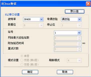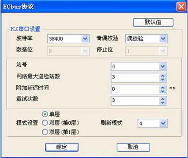 ECBUS網絡設置非常簡單,通過系統塊進行參數設置。站號的設置從0開始,0號站是網絡的啟動和設置站點,網絡最大巡檢站數、附件延遲時間、重試次數、模式設置只需對0號站進行設置。