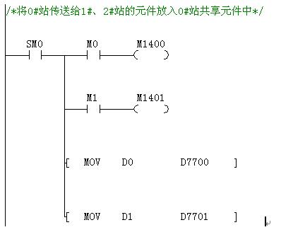 對于每臺PLC,無需編通訊程序,只需要將傳送給其他PLC的元件值放到自己的共享元件中即可,數據會自動刷新,其他PLC只要讀取相應的共享區元件值。
