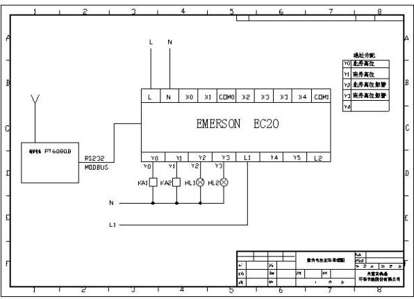 采用一臺EC20-1006BRA作簡單的繼電連鎖,除了和舊系統進行連鎖(互鎖),還有變頻器的簡單啟動和停止及報警。本系統還另外裝有一臺EC20-1006BRA,通過串口與一臺數傳電臺相通訊(MODBUS),來實現和另外一個水泵房(凈環泵房)實現連鎖。當璇流井有高液位報警時,通過PLC及數傳電臺傳送到凈環泵房,由操作人員確定水泵的啟動和停止(由于二者距離太遠,且不適合電纜敷設,所以采用無線數傳的方式)。 其中璇流井內PLC設置為主站,凈環內PLC為從站。數傳電臺采用深圳科立訊生產的PT6080無線數傳電臺是利用先進的單片機技術,無線射頻技術,數字處理技術設計的功率較大,體積較小的模塊式半雙工數傳電臺,采用SMT新工藝,選用高質量的元器件。抗干擾能力強,精致堅固,結構緊湊,安裝方便。數話兼容,數傳可優先。RS232、RS485及TTL多種接口可供選擇,適應面寬。參見下面原理圖: