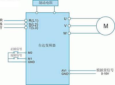 變頻器AVI/GND端子提供與數控系統速度模擬量,AVI接數控系統模擬量接口正信號,GND接負信號,信號為0-10V模擬電壓信號,控制主軸轉速。M0/M1/GND為變頻器的正轉/反轉信號端子,通常由數控系統發出正轉信號FWD或者反轉REV,來驅動中間繼電器,中間繼電器的常開接點接入變頻器M0/GND或者M1/GND,從而控制變頻器的正反轉。