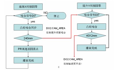垂直跟蹤 Y軸的CAPTURE信號(hào)DI7就是接到水平跟蹤X軸的D02:CAM_AREA信號(hào)觸發(fā)凸輪嚙合的,噴嘴輸液泵的開啟也是通過Y 軸的D02:CAM_AREA信號(hào)來控制的。因?yàn)橹挥兴礁橷軸和送瓶主動(dòng)軸同步后,垂直跟蹤Y軸才能下降,將噴嘴插入瓶口。