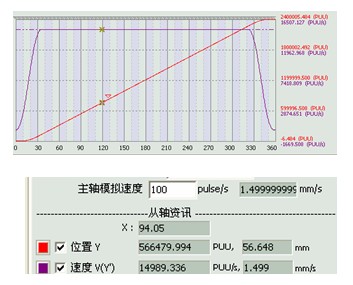 其中虛線為模擬器產(chǎn)生的主動(dòng)軸速度曲線,實(shí)線為X水平跟蹤軸的速度曲線。當(dāng)移動(dòng)光標(biāo),使用者就可以在軟體上清楚地觀察到主動(dòng)軸模擬速度(即,送瓶伺服的速度)和從動(dòng)軸速度(即XX水平跟蹤軸)。