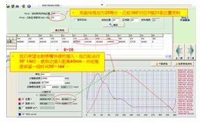 對(duì)于上述凸輪曲線,可以看到噴嘴的下行和返回行程都規(guī)劃在曲線內(nèi),其Y軸的提升速度可以隨著主動(dòng)軸的速度同步變化。此外,對(duì)于Y軸提升伺服加減速的處理,在不影響最終位置的前提下,可以適當(dāng)修改表格中加速和減速區(qū)域的數(shù)值,使速度曲線平滑!