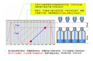 當(dāng)進(jìn)入到設(shè)定同步區(qū)輸出同步范圍后,X軸D0CAM-AREA信號(hào)ON,控制提升軸伺服Y軸凸輪嚙合。