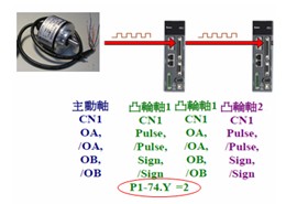 By-pass命令傳遞功能是A2智能伺服的另一大功能特色,利用By-pass功能,主動(dòng)軸編碼器信號(hào)(脈沖命令信號(hào))輸入到其他從動(dòng)軸CN1,依次串接多顆伺服。即一主軸指揮多從軸同動(dòng)。