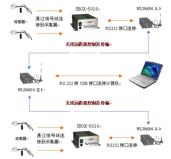 系統采用UBOX-5016爆破振動智能監測儀、WLS9600無線遙測模塊,與速度傳感器相連,組成多點工程爆破振動無線遙測系統;