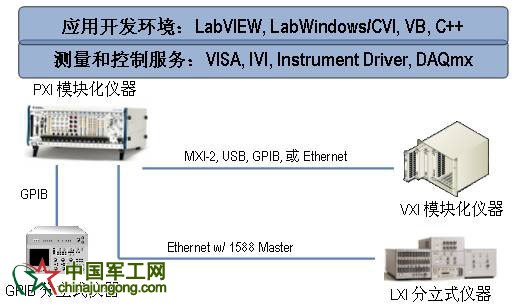 在圖1的混合系統中,底層的硬件使用了包含PXI、GPIB、LXI等多種測試總線,而在上層卻是一個由測量和控制服務 層和應用開發層組成的統一的軟件架構。測量和控制服務層包含靈活的設備驅動,用于連接軟件和硬件并簡化硬件配置部分的測試代碼。為了將硬件無縫的集成到軟 件中去,工程師們希望能夠有高性能、易于編程且持續可升級的API來幫助開發。VISA(Virtual Instrumentation Software Architecture)標準就是提供了這樣一種通用的API,負責和驅動軟件進行通訊,并且獨立于您所使用的儀器總線。無論是使用PXI, VXI, GPIB, LAN還是LXI總線,VISA都提供了標準的函數庫和儀器進行通訊,同時從軟件上保證了總線之間的互換性。此外,網上超過4000種可供下載的儀器驅動 可以幫助您簡化儀器功能的復雜性,快速的開發儀器驅動應用。作為儀器驅動的另一種標準,IVI(Interchangeable Virtual Instrument)標準定義了通用儀器的互換性,對于一些指定的儀器類,如示波器,信號源等,您可以隨意的將現在使用的儀器換成一臺其他生產廠家、甚 至是其他總線的另一臺同類的儀器,而不需要修改任何的軟件測試代碼。