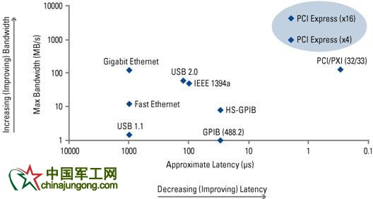 當我們打開現代PC的機箱,我們會發現顯卡往往是基于高帶寬的PCI、AGP或是最新的PCI Express x16總線,很少能見到基于USB,Ethernet等外部總線的顯卡;同樣,一臺分立式儀器雖然在外部提供了USB,Ethernet/LAN以及 RS-232等接口用于和PC的通訊,但儀器內部還是使用了PCI總線用于內部數據的傳輸。上面的兩個例子都使用了內部總線用于海量數據的傳輸,因為像 PCI這樣的內部總線,相比于外部總線,能夠提供更高的總線帶寬和更低的傳輸延遲(見圖2)。接下來就讓我們來討論一下一些常見的內部總線。