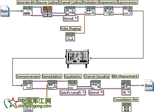 下圖顯示了National Instruments的LabVIEW圖形化的語言和NI的PXI平臺,通過軟件無線電的方法再現了上述通訊系統的功能框圖。模塊化的硬件除了完成物理上的上下變頻過程外,其余的功能都是通過軟件來完成的。